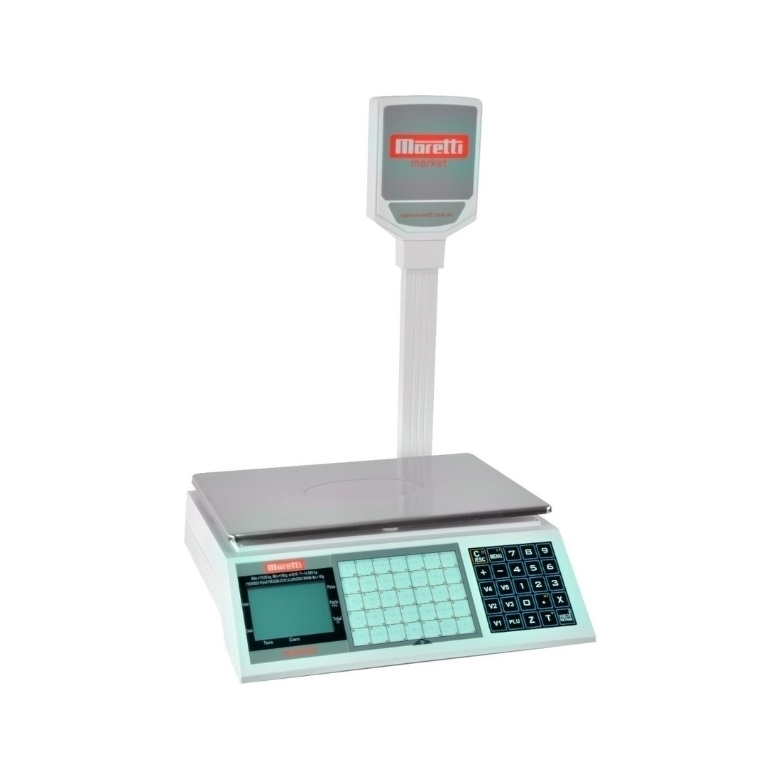 La Moretti Market cuenta con visor doble (cliente/operador), bandeja de acero inoxidable y teclado sellado, lo que la hace perfecta para almacenes, mercados, dietéticas y carnicerías. Su batería interna permite usarla sin estar conectada a la red eléctrica.