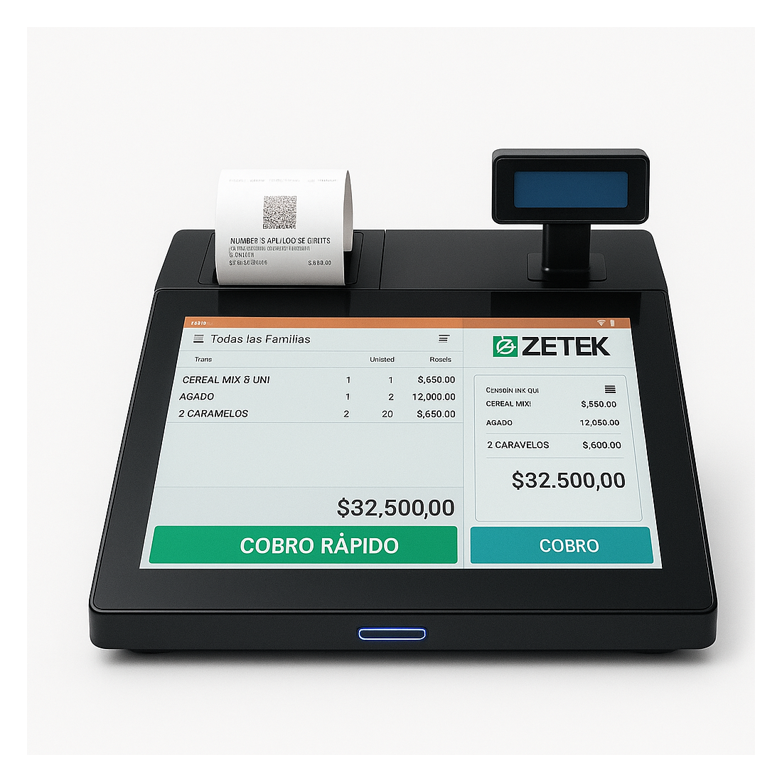Diseñada para puntos de venta que buscan agilidad, rendimiento y cumplimiento fiscal, ofrece una experiencia profesional en un formato compacto con soporte técnico ZETEK.